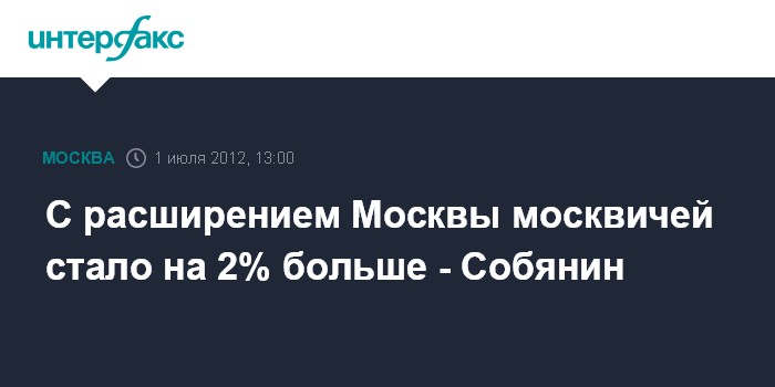 Троицк. 1 июля. INTERFAX.RU - Присоединение к Москвы новых территорий позволит гармонично развиваться всей 20-миллионной столичной агломерации, заявил в воскресенье мэр столицы Сергей Собянин на совещании по работе правительства Москвы на новых территориях. По его словам, с сегодняшнего дня "количество москвичей стало на 230 тыс больше, это 2% от нынешнего населения столицы или 1,5-годичный естественный прирост населения".