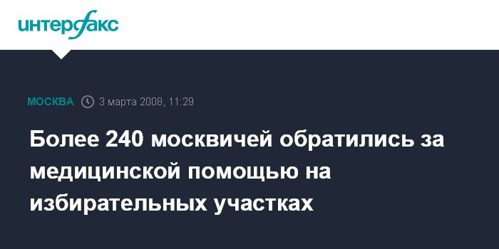 Москва. 3 марта. INTERFAX.RU - На столичных избирательных участках во время проведения президентских выборов к медикам за помощью обратились 244 человека, сообщила "Интерфаксу" пресс-секретарь департамента здравоохранения Москвы Любовь Жомова в понедельник.