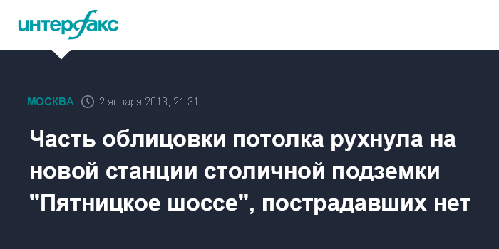 Москва. 2 января. ИНТЕРФАКС-МОСКВА - В северном вестибюле станции "Пятницкое шоссе" Арбатско-Покровской линии Московского метрополитена в кассовой зоне в среду вечером произошло обрушение облицовки потолка.
