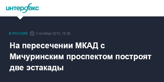 Москва. 2 октября. INTERFAX.RU - Две новые эстакады будут построены на пересечении МКАД с Мичуринским проспектом в 2014 году, сообщает пресс-служба подрядчика проекта компании TVA Construction, входящей в холдинг "СКМ Групп".
