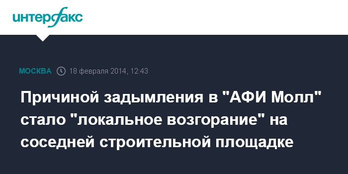 Москва. 18 февраля. INTERFAX.RU - Задымление произошло в торгово-развлекательном центре (ТРЦ) "АФИ Молл" из-за возгорания на строительной площадке по соседству, сообщил представитель ТРЦ Михаил Лоскутов.