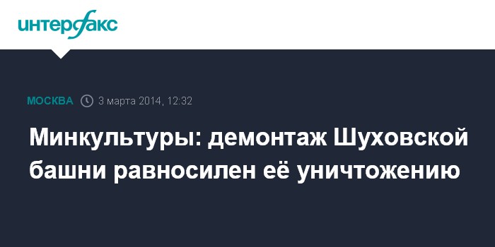 Москва. 3 марта. INTERFAX.RU - Демонтаж Шуховской башни недопустим, считает Министерство культуры РФ.
