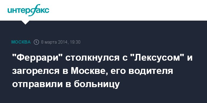 Москва. 8 марта. INTERFAX.RU - - "Лексус" и "Феррари" столкнулись на северо-востоке Москвы, пострадал человек, сообщили "Интерфаксу" в субботу в пресс-службе столичной ГИБДД