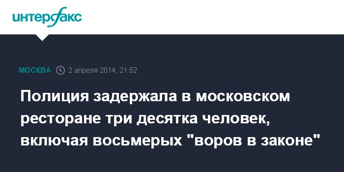 Москва. 2 апреля. INTERFAX.RU - Полицейские пресекли в одном из ресторанов Москвы сходку "воров в законе", задержаны около 30 человек, сообщает в среду вечером пресс-служба МВД РФ.