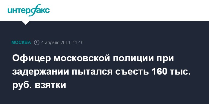 Москва. 4 апреля. INTERFAX.RU - Сотрудник столичной полиции, задержанный в среду по подозрению в вымогательстве, пытался съесть деньги во время задержания, сообщил "Интерфаксу" источник в правоохранительных органах.