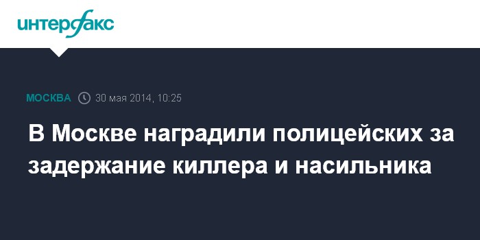 Москва. 30 мая. INTERFAX.RU - Московские полицейские, задержавшие накануне киллера и насильника, поощрены денежной премией, следует из приказа начальника ГУ МВД России по Москве. Руководство главка будет ходатайствовать перед МВД России о представлении их к государственным наградам.