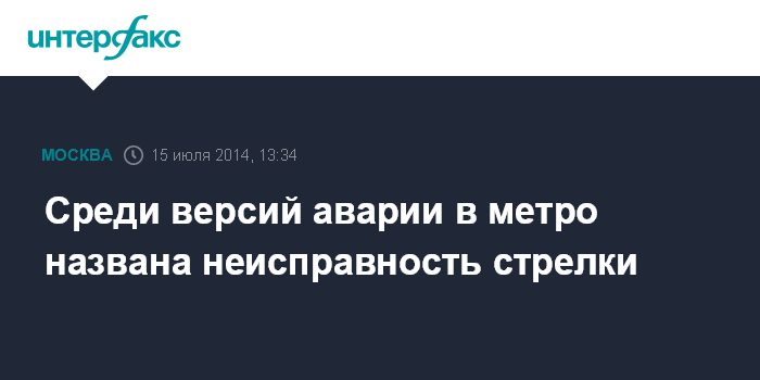 Москва. 15 июля. INTERFAX.RU - В качестве одной из версий аварии в московском метро рассматривается также неисправность стрелочного перевода, у которого, согласно данным очевидцев, и произошла авария. Об этом сообщил "Интерфаксу" источник, знакомый с ситуацией.