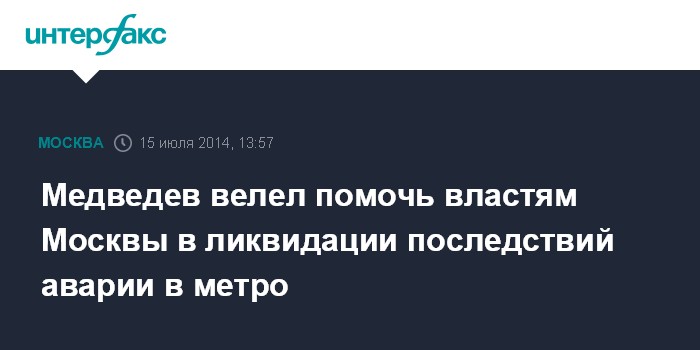 Москва. 15 июля. INTERFAX.RU - Премьер-министр Дмитрий Медведев поручил правительству оказать московским властям содействие в ликвидации последствий аварии в столичном метро, а также оказать помощь пострадавшим.