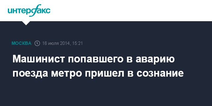 Москва. 16 июля. INTERFAX.RU - Машинист поезда, с которым произошла авария накануне в московском метро, жив, пришел в себя и адекватен, сообщил первый замглавы департамента здравоохранения столицы Алексей Хрипун.