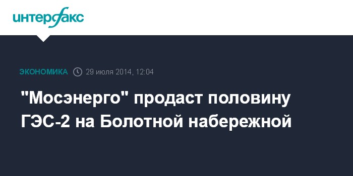 Москва. 29 июля. INTERFAX.RU - "Мосэнерго" собирается продать 50% в уставном капитале ООО "ГЭС-2". Торги пройдут 5 сентября, говорится в материалах компании, опубликованных в "Российской газете".