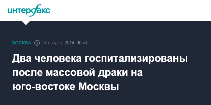 Москва. 17 августа. INTERFAX.RU - Массовая драка с участием 20 человек произошла на юго-востоке Москвы, сообщили "Интерфаксу" в пресс-службе ГУ МВД России по Москве.