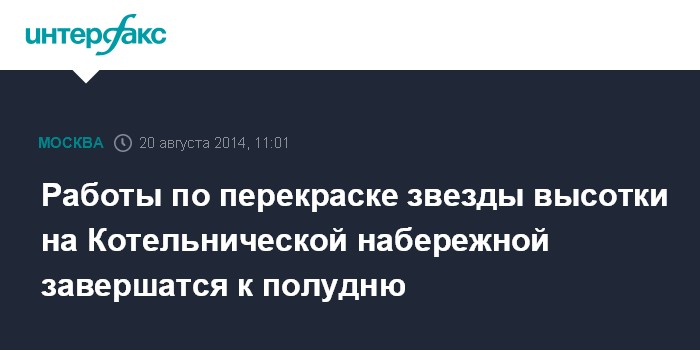 Москва. 20 августа. INTERFAX.RU - Специальная бригада верхолазов перекрашивает в золотистый цвет звезду высотки на Котельнической набережной, изуродованную неизвестными в среду утром, сообщил "Интерфаксу" источник в экстренных службах города.