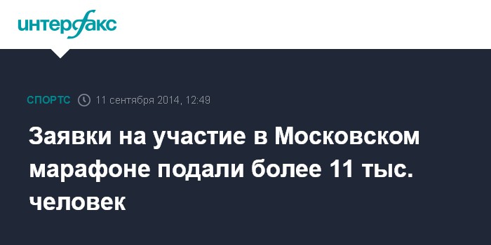 Москва. 11 сентября. INTERFAX.RU - Заявки на участие во втором Московском марафоне, который пройдет 21 сентября, подали более 11 тысяч человек из России и других стран, сообщается в пресс-релизе соревнований.