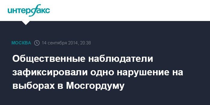 Москва. 14 сентября. INTERFAX.RU - За весь день голосования в Москве общественные наблюдатели зафиксировали одно нарушение, сообщил руководитель общественного штаба по наблюдению за выборами в Мосгордуму Михаил Барщевский на итоговой пресс-конференции в воскресенье.