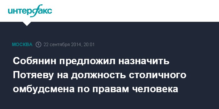 "Срок полномочий нынешнего омбудсмена Александра Музыкантского истекает в конце сентября. В связи с этим Собянин внес в гордуму предложение о назначении на должность уполномоченного на пятилетний срок Потяевой", - рассказал собеседник агентства.