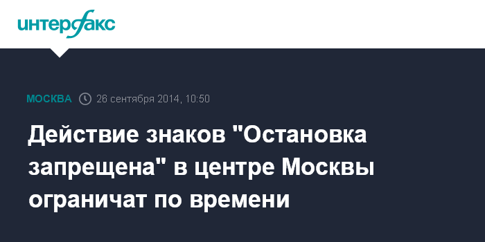 Москва. 26 сентября. INTERFAX.RU - Департамент транспорта Москвы прикрепит к дорожным знакам 3.27 "Остановка запрещена" в центре Москвы таблички, на которых будет указано время суток, когда они действуют, сообщает M24 со ссылкой на члена рабочей группы при департаменте по платной парковке Илью Свиридова.