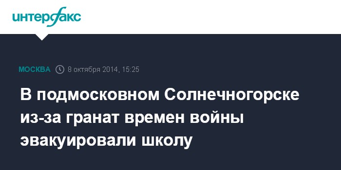 Москва. 8 октября. INTERFAX.RU - В подмосковном Солнечногорске эвакуировали школу после обнаружения рядом с ней четырех гранат времен Великой Отечественной войны, сообщили "Интерфаксу" в среду в пресс-службе ГУ МВД РФ по Московской области
