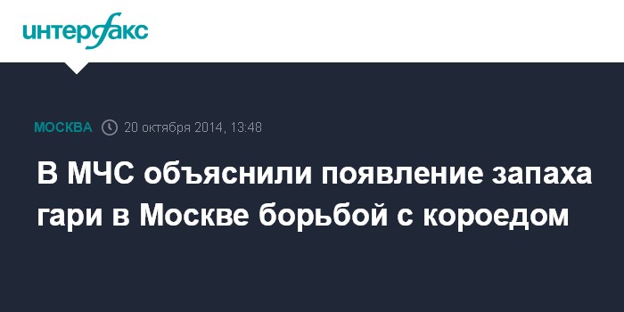 Москва. 20 октября. INTERFAX.RU - Запах гари в Москве может ощущаться из-за сжигания древесины в Подмосковье, сообщает пресс-служба ГУ МЧС России по Московской области. По информации ведомства, сжигание сухих веток и пней на местах лесосек является плановым и проводится для уничтожения личинок короеда.