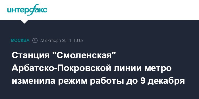 Станция "Смоленская" Арбатско-Покровской линии метро изменила режим работы до 9 декабря