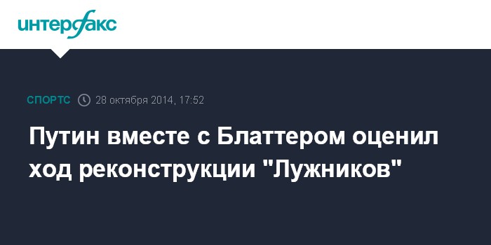 Москва. 28 октября. INTERFAX.RU - Президент России Владимир Путин и президент Международной федерации футбола (FIFA) Йозеф Блаттер осмотрели во вторник реконструируемую к чемпионату мира 2018 года Большую спортивную арену "Лужники".