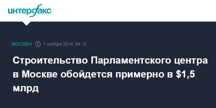 Москва. 7 ноября. INTERFAX.RU - Для строительства Федерального Парламентского центра в районе Мневниковской поймы в Москве может понадобится $1,5 млрд, сообщил депутат Госдумы РФ Владимир Ресин, являющийся первым замруководителя межведомственной рабочей группы по проектированию и строительству Парламентского центра.