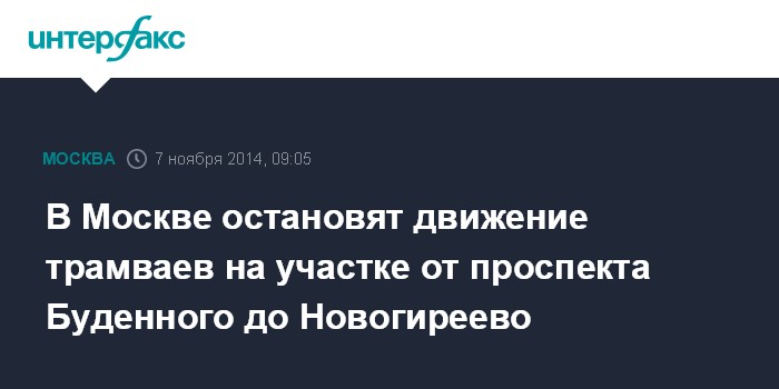 Москва. 7 ноября. INTERFAX.RU - В связи с переключением трамвайных путей в зоне строительства Северо-Восточной хорды на шоссе Энтузиастов 8 и 9 ноября закрывается трамвайное движение на участке от проспекта Буденного до Новогиреево, сообщили "Интерфаксу" в пресс-службе ГУП "Мосгортранс" в пятницу.
