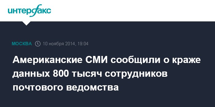 Москва. 10 ноября. INTERFAX.RU - Почтовое ведомство США проинформировало о взломе своих компьютерных систем, из-за чего могли быть перехвачены данные более 800 тыс. сотрудников ведомства, сообщает в понедельник Washington Post.