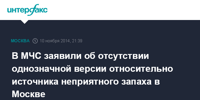 Москва. 10 ноября. INTERFAX.RU - В МЧС заявили, что пока не установили источник неприятного запаха в Москве.