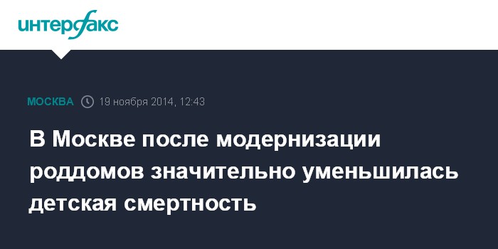 В пресс-службе мэра и правительства Москвы сообщили, что в 2013-2014 годах в столичных роддомах и детских больницах было дополнительно создано 450 коек отделений патологии и 210 коек отделений реанимации и интенсивной терапии новорожденных. "В результате - даже с учетом выхаживания детей с экстремально низкой массой тела - уровень младенческой смертности в Москве снижен до 6,2 случаев на 1 тысячу родившихся живыми, что является хорошим показателем для крупных городов мира",- отмечают в пресс-службе.