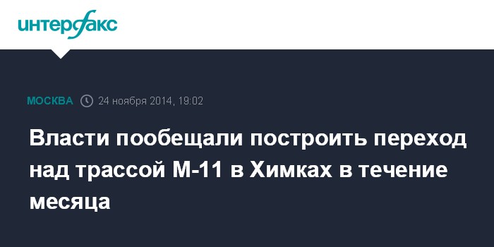 Москва. 24 ноября. INTERFAX.RU - Быстровозводимый надземный переход через автодорогу М-11 Москва - Санкт-Петербург в микрорайоне Левобережный в Химках планируется построить к концу 2014 года. Решение проблемы жителей микрорайона Левобережный, оказавшихся отрезанными от социальных объектов, обсуждалось в понедельник в подмосковном Доме правительства, передал корреспондент "Интерфакса".