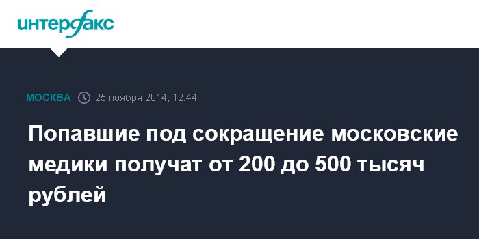 Москва. 25 ноября. INTERFAX.RU - Работники медучреждений Москвы, сокращаемые в процессе оптимизации отрасли здравоохранения, получат единовременные выплаты в размере от 200 до 500 тысяч рублей.