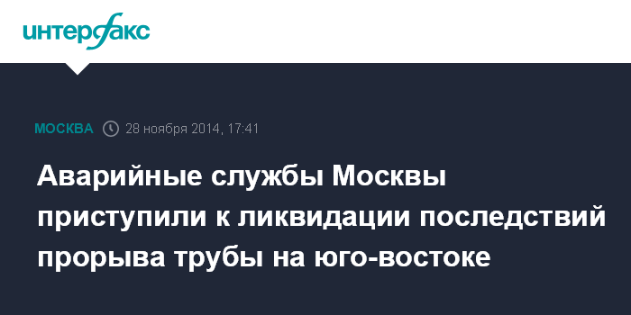 Москва. 28 ноября. INTERFAX.RU - Специалисты Мосводоканала ликвидируют последствия прорыва трубы на юго-востоке Москвы.