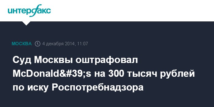 Москва. 4 декабря. INTERFAX.RU - Арбитражный суд Москвы во вторник, 2 декабря, решил привлечь ЗАО "Москва-Макдоналдс" к административной ответственности и назначил ему наказание в виде штрафа в размере 300 тысяч рублей, говорится в сообщении на сайте суда.