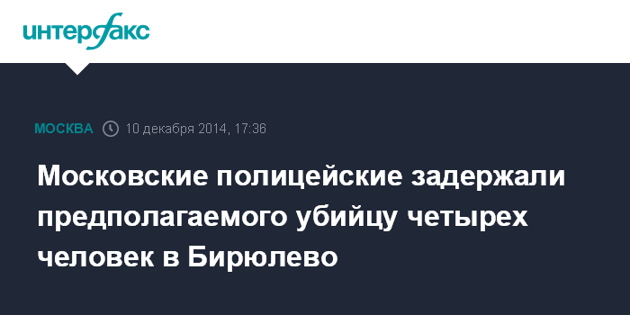 Москва. 10 декабря. INTERFAX.RU - Столичная полиция задержала подозреваемого в убийстве четырех человек в Бирюлево, сообщил "Интерфаксу" в среду источник в правоохранительных органах.