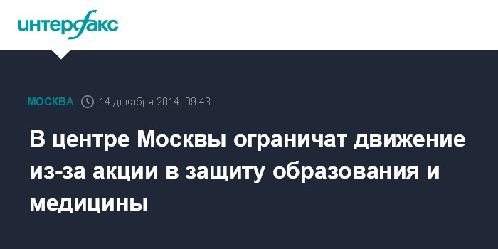 Москва. 14 декабря. INTERFAX.RU - Движение транспорта будет перекрыто на два часа в воскресенье днем на нескольких улицах в центре Москвы из-за акции, которая посвящена проблеме столичной медицины и образования.
