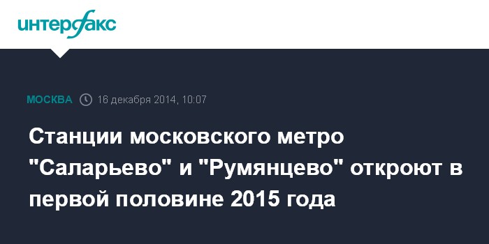 Москва. 16 декабря. INTERFAX.RU - Станции "Саларьево" и "Румянцево" Сокольнической линии московского метро введут в эксплуатацию в первом полугодии следующего года, сообщил заместитель мэра Москвы по вопросам градостроительной политики и строительства Марат Хуснуллин.