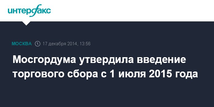 Москва. 17 декабря. INTERFAX.RU - Московский закон "О торговом сборе", вводящий с 1 июля 2015 года новый вид налоговой нагрузки, принят на заседании Мосгордумы в среду.