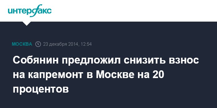 Москва. 23 декабря. INTERFAX.RU - Мэр столицы Сергей Собянин предлагает снизить размер минимального взноса на капитальный ремонт многоквартирных домов в Москве в 2015 году с 18 до 15 рублей, что примерно составляет 20 процентов.