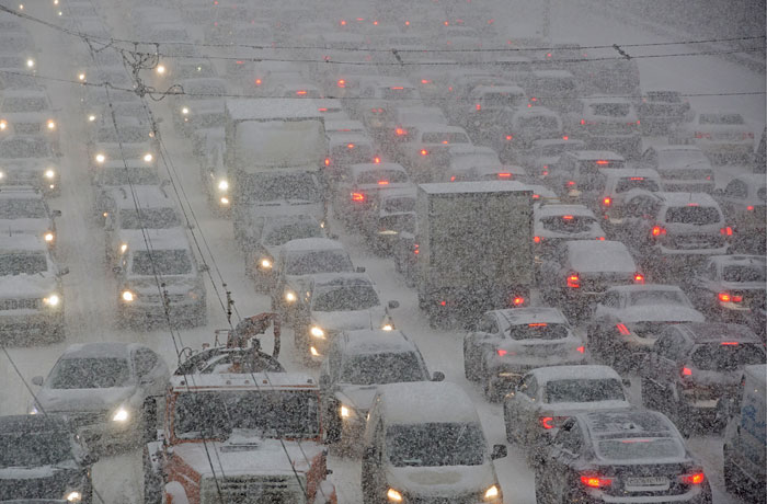 Ранним утром в четверг на столицу обрушился мощный снегопад, который продлился до вечера. Из-за непогоды в городе произошел транспортный коллапс.