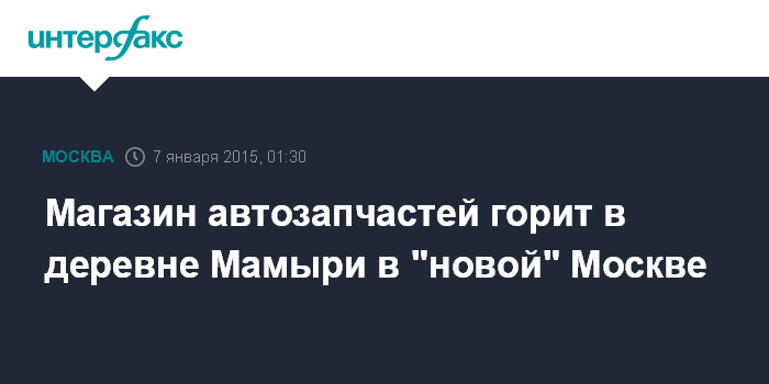Москва. 7 января. INTERFAX.RU - Магазин автозапчастей загорелся в деревне Мамыри в "новой" Москве, сообщили "Интерфаксу" в среду в пресс-службе столичного ГУ МЧС РФ.