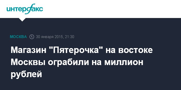 Москва. 30 января. INTERFAX.RU - Магазин "Пятерочка" в Восточном административном округе Москвы ограбили на миллион рублей, сообщил "Интерфаксу" источник в правоохранительных органах.