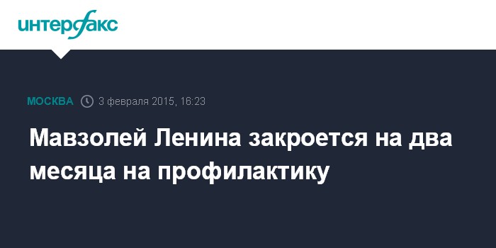 Москва. 3 февраля. INTERFAX.RU - Мавзолей Владимира Ленина в Москве будет закрыт для посетителей два месяца в связи с проведением плановых профилактических работ, сообщила "Интерфаксу" пресс-секретарь Федеральной службы охраны Виктория Богомолова.
