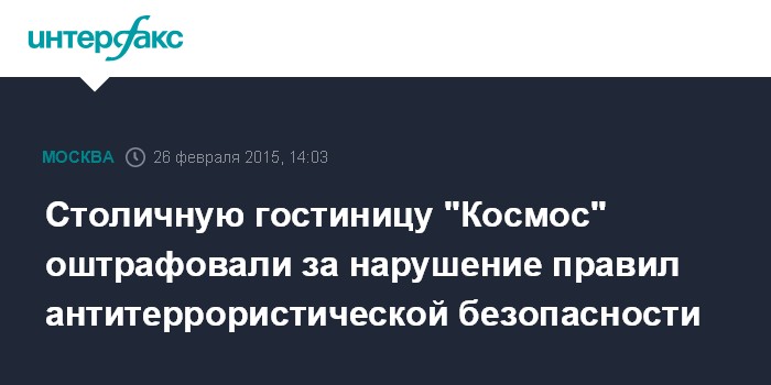Москва. 26 февраля. INTERFAX.RU - Столичная гостиница "Космос" и ее руководитель оштрафованы на 370 тысяч рублей за нарушение правил противопожарной и антитеррористической безопасности, сообщает прокуратура Москвы в четверг.