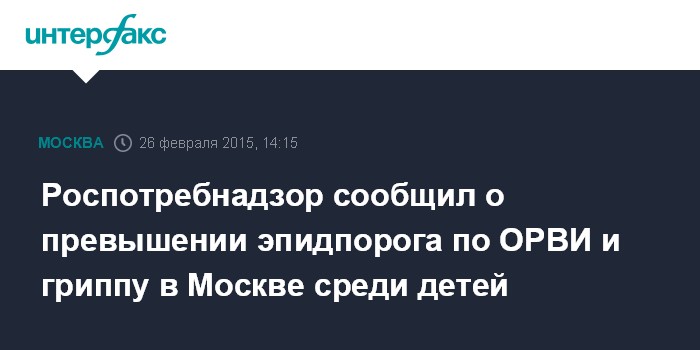 Москва. 26 февраля. INTERFAX.RU - Эпидемический порог заболеваемости гриппом и ОРВИ в столице в настоящее время превышен только среди детей, сообщила начальник управления Роспотребнадзора по Москве Елена Андреева на встрече с депутатами Мосгордумы в четверг.