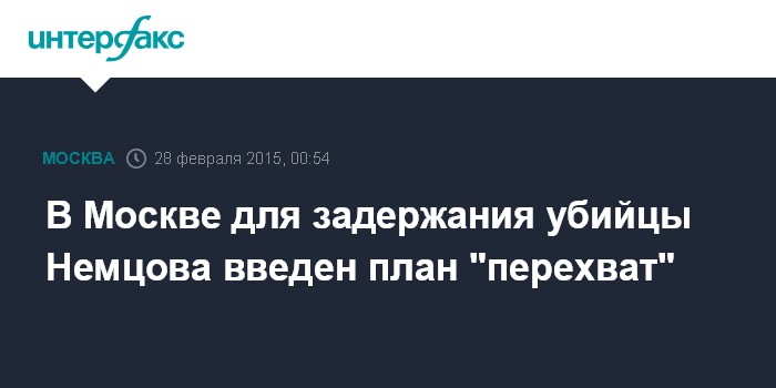 Москва. 28 февраля. INTERFAX.RU - В Москве для задержания убийцы или убийц политика Бориса Немцова введен план "перехват", сообщили в пресс-центре столичного отделения МВД.