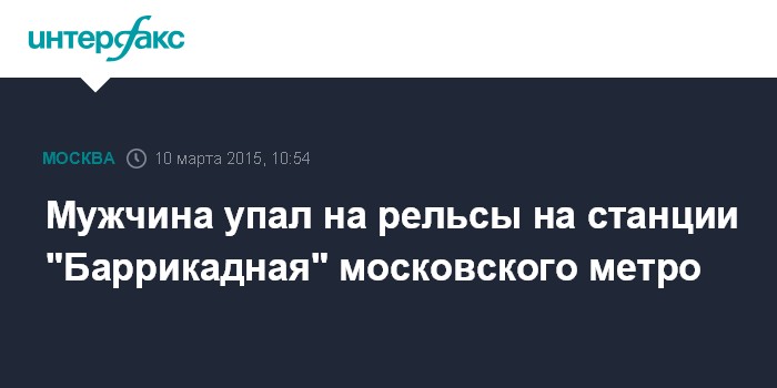 Москва. 10 марта. INTERFAX.RU - Мужчина упал на рельсы на станции "Баррикадная" Таганско-Краснопресненской линии столичного метро, сообщил "Интерфаксу" источник в экстренных службах города во вторник.