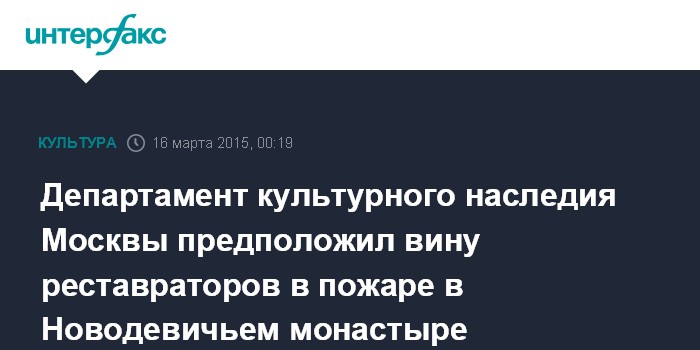 Москва. 16 марта. INTERFAX.RU - Причиной пожара колокольни Новодевичьего монастыря могла стать недобросовестность подрядчика, проводившего реставрационные работы, сообщили "Интерфаксу" в пресс-службе департамента культурного наследия Москвы.