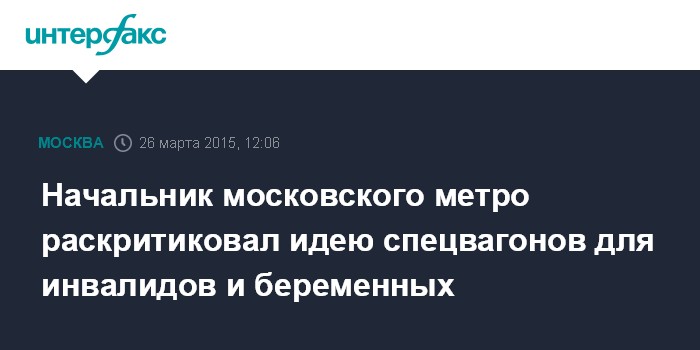 Москва. 26 марта. INTERFAX.RU - Начальник московского метрополитена Дмитрий Пегов негативно отнесся к идее сенатора Вадима Тюльпанова о выделении отдельных вагонов метро для пожилых, инвалидов, беременных и пассажиров с детьми.