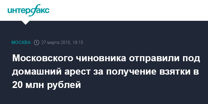Москва. 27 марта. INTERFAX.RU - Чертановский суд Москвы отправил под домашний арест на два месяца начальника одного из отделов департамента городского имущества Москвы, подозреваемого во взяточничестве на 20 млн рублей.