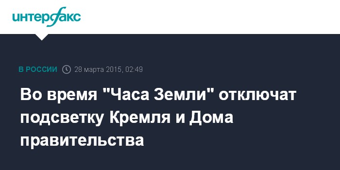 "На один час - с 20:30 до 21:30 по московскому времени будет выключено внешнее освещение официальной резиденции главы государства - Московского Кремля", - подтвердили "Интерфаксу" в пресс-службе президента РФ.